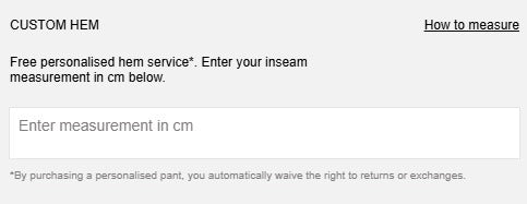 Free personalised hem service*. Enter your inseam measurement in cm below.